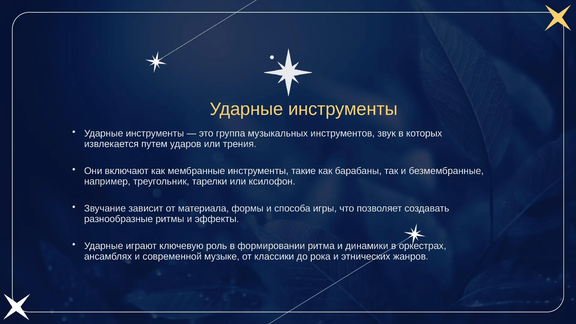 | Бас-барабан | Крупный ударный инструмент‚ производит глубокий гудящий звук на низких частотах. | Создание ритма‚ акцентирование тактовых долей. |